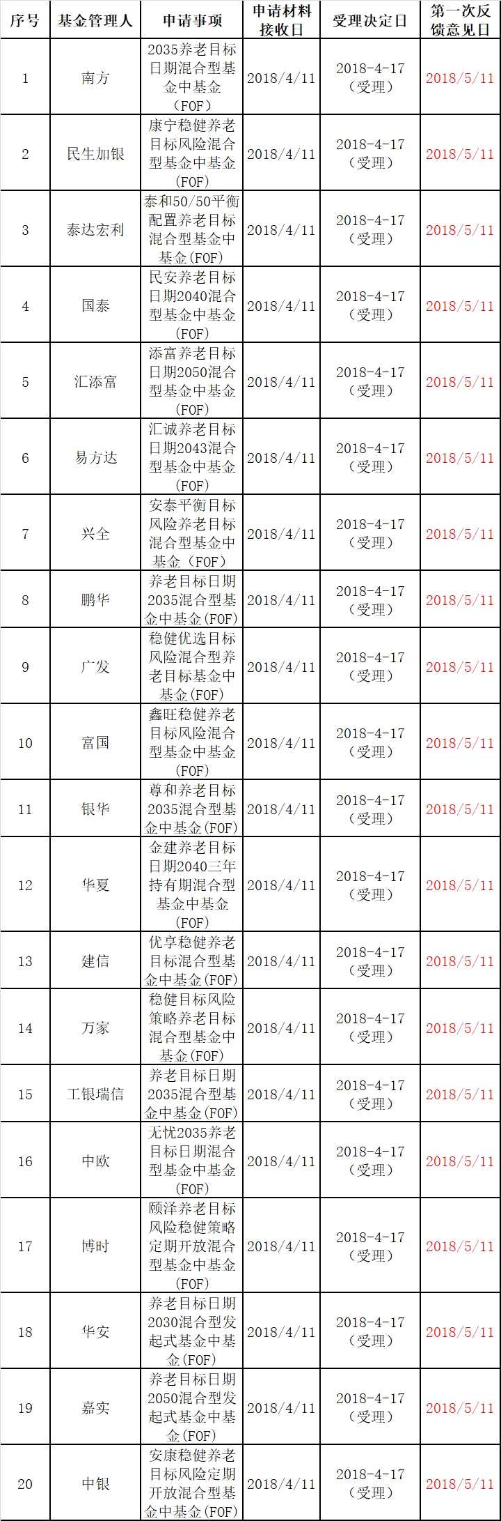 表1:首批獲得反饋意見的20只養(yǎng)老目標(biāo)基金列表(數(shù)據(jù)來源:證監(jiān)會官網(wǎng))