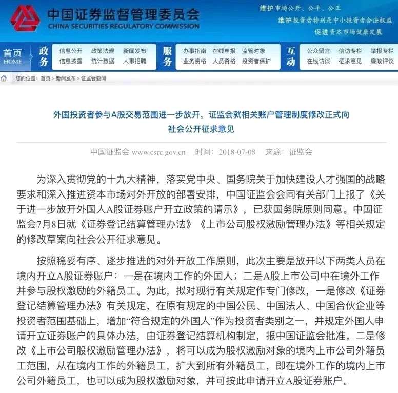 證監(jiān)會今日就賬戶管理制度修改正式向社會公開征求意見,進一步放開外國投資者參與A股交易,在境內(nèi)工作的外國人、在境外工作的境內(nèi)上市公司外籍員工,無論是否在中國,都可以開立A股證券賬戶參與交易。