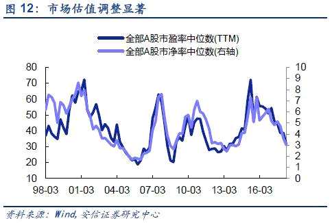 七、市場(chǎng)整體估值處于底部區(qū)間。絕對(duì)估值來(lái)看,市場(chǎng)整體處于估值底部。當(dāng)前上證綜指、中小板指和創(chuàng)業(yè)板指PE( TTM )分別為12.3倍,24.6倍和39.9倍,均處于歷史低位。而從中位數(shù)來(lái)看,當(dāng)前A股市盈率與市凈率中位數(shù)分別為29.97倍和2.87倍,為2013年二季度以來(lái)最低,與上一輪低谷2012年三季度市盈率26.55倍和2013年二季度市凈率2.45倍接近。