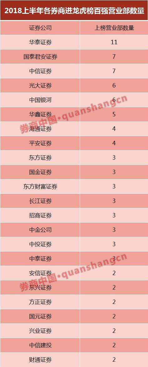 據(jù)券商中國記者統(tǒng)計(jì),華泰證券一共有11個(gè)營(yíng)業(yè)部進(jìn)入龍虎榜百強(qiáng)名單中,國泰君安證券和中信證券分別有7個(gè)營(yíng)業(yè)部上榜,光大證券(601788,股吧)和銀河證券分別有6個(gè)營(yíng)業(yè)部入駐百強(qiáng)榜單。