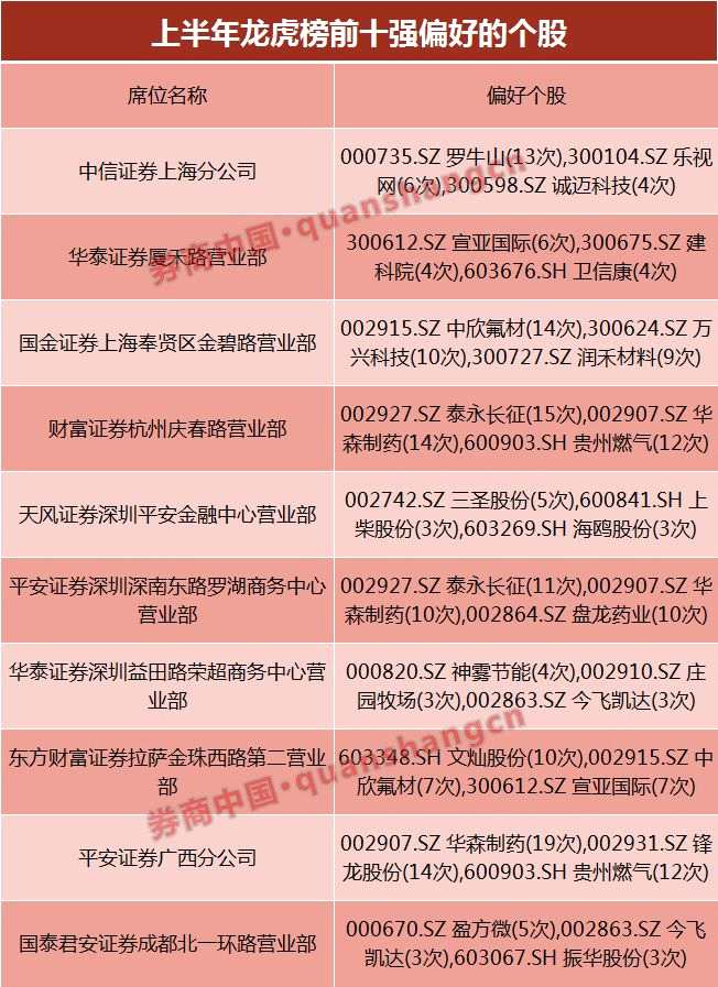 比如上半年因華鋒股份(002806,股吧)、九典制藥(300705,股吧)等而頻上龍虎榜營(yíng)業(yè)部的中泰證券深圳歡樂海岸營(yíng)業(yè)部、再比如突然躋身榜首的中信證券(600030,股吧)上海分公司,則因羅牛山(000735,股吧)等吸引眼球無數(shù)。