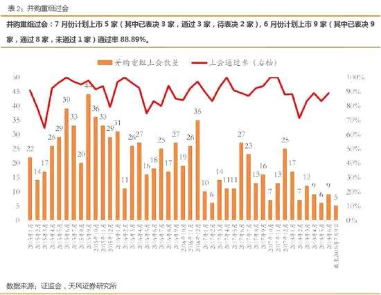 其他我們重點(diǎn)關(guān)注的指標(biāo)里:截至7月6日,7月份股權(quán)融資規(guī)模1,044.24億元,其中首發(fā)10.62億元,增發(fā)1,033.62億元;6月份股權(quán)融資規(guī)模792.08億元,其中首發(fā)404.02億元,增發(fā)352.79億元。7月份計(jì)劃上市5家(其中已表決3家,通過(guò)3家,待表決2家),6月份計(jì)劃上市9家(其中已表決9家,通過(guò)8家,未通過(guò)1家)通過(guò)率88.89%。