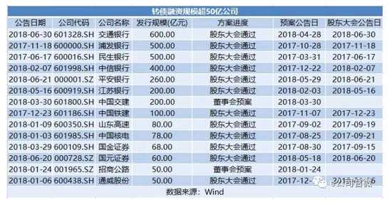 Wind統(tǒng)計(jì)顯示,截至7月10日,不包括交換債,今年以來154家公司新發(fā)布轉(zhuǎn)債預(yù)案,合計(jì)擬募資約3600億元。如果加上去年已提出預(yù)案尚未實(shí)施的預(yù)案,包括巨額募資的民生、浦發(fā)轉(zhuǎn)債等,當(dāng)前仍有近180家公司發(fā)布轉(zhuǎn)債預(yù)案,需累計(jì)募集大約5000億元。其中,在預(yù)案中,發(fā)行規(guī)模超百億的有8家公司,除了中國(guó)交建(601800,股吧)、中國(guó)鐵建(601186,股吧),其他6家公司都來自于銀行體系。