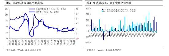 A股基本面未出現(xiàn)明顯惡化,內(nèi)外資進(jìn)出分化明顯。今年A股市場在1月春季躁動過后,便進(jìn)入接近半年的下跌區(qū)間,目前上證綜指最低點2691點較1月高點3587點累計跌幅已達(dá)25%。從海內(nèi)外視角觀察,我們看到一個很有意思的現(xiàn)象,年初以來A股和港股出現(xiàn)明顯分化,MSCI中國大盤(除A股)指數(shù)、恒生指數(shù)、恒生國企指數(shù)、上證綜指年初至今漲跌幅分別為-4.8%、-4.7%、-8.2%、-14.4%,A股跌幅遠(yuǎn)大于港股。但兩邊市場上市公司多數(shù)都是中國境內(nèi)公司,基本面數(shù)據(jù)顯示兩邊市場未出現(xiàn)明顯惡化,全部A股16年/17年/18Q1凈利潤同比增速為16.3/18.4/14.4%,恒生指數(shù)成分股16年/17年凈利潤同比增速為-14.9/28.1%,恒生國企指數(shù)成分股為-9.8/17.7%。微觀數(shù)據(jù)之外,國內(nèi)已公布的宏觀數(shù)據(jù)也未出現(xiàn)明顯惡化,1-5月工業(yè)增加值累計同比6.9%,2017年全年6.6%,1-6月CPI累計同比2.0%,2017年全年1.6%??梢夾股較港股大幅下跌的原因并不在基本面,否則應(yīng)該是A股與港股跌幅相當(dāng)。我們認(rèn)為這一輪市場調(diào)整,主要源于去杠桿背景下資管新規(guī)的推出影響了股市微觀資金供求,疊加外部中美貿(mào)易戰(zhàn)影響了市場情緒。今年以來資金面一個很顯著的分化是陸港通北上南下資金走向,雖然A股近期表現(xiàn)疲弱,但陸港通北上資金卻在加速流入,4、5、6月份分別凈流入387、508、285億元,今年上半年累計凈流入1658億元,較2017年月均凈流入166億元,全年1998億元大幅提升,我們預(yù)計今年和未來幾年北上資金能保持年均3000億左右的凈流入;而較A股表現(xiàn)更強的港股,陸港通南下資金卻出現(xiàn)凈流出,4、5、6月份分別凈流出49、18、65億元,今年上半年累計凈流入940億元,較2017年月均凈流入257億元,全年3080億元大幅縮減,內(nèi)資退、外資進(jìn)是近半年A股市場下跌背后的投資者群像。