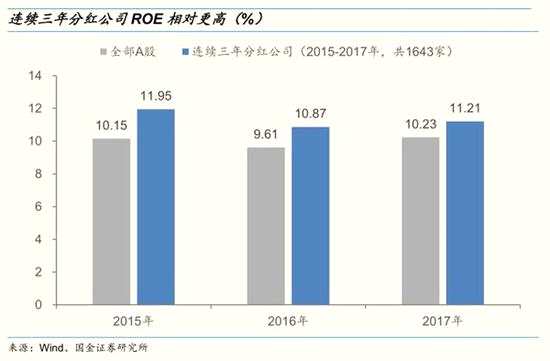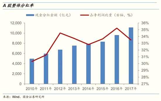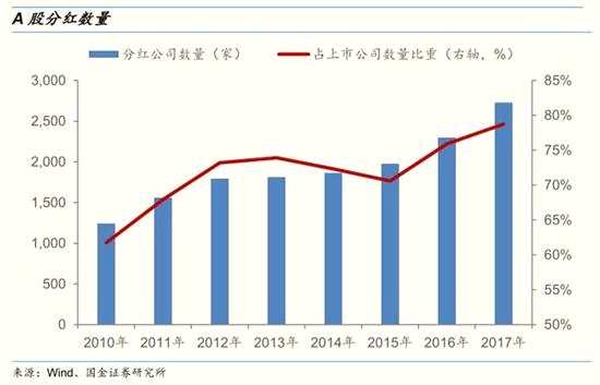 二、A股目前的分紅制度屬于“半強制分紅”,A股正在構(gòu)建積極分紅的氛圍,長期穩(wěn)定分紅公司群體基本形成。2008年10月證監(jiān)會出臺《關(guān)于修改上市公司現(xiàn)金分紅若干規(guī)定的決定》,除此之外,證監(jiān)會、交易所還會對上市公司現(xiàn)金分紅出臺相關(guān)監(jiān)管指引。2017年共有2729家A股公司進行現(xiàn)金分紅(含擬進行現(xiàn)金分紅,還未正式實施的公司),占全部上市公司數(shù)量的78.8%,創(chuàng)歷史新高。其中,連續(xù)三年均進行現(xiàn)金分紅的公司有1643家,占比達58.7%;另外,分紅率角度來看,2010年以來A股整體分紅率較為穩(wěn)定,維持在30%以上,2017年分紅率為33.5%。2015年以來A股股息率穩(wěn)中有升,2015年-2017年股息率分別為1.47%、1.76%,1.81%。