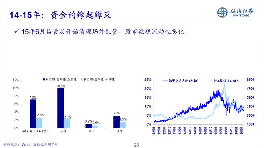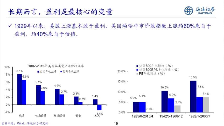 我2014年6月24日開始看多市場(chǎng),雖然我不是最早看多的,卻是最堅(jiān)定的看多者,當(dāng)時(shí)我看的是大牛市而不是熊市反彈。尤其是上證綜指從2000點(diǎn)漲到2300多點(diǎn)時(shí)謹(jǐn)慎的人很多,我當(dāng)時(shí)寫了一篇報(bào)告叫《有一種冷叫你媽覺得你冷》,報(bào)告的意思是,市場(chǎng)本身沒問題、不冷,有人過(guò)慮了。為什么在那個(gè)時(shí)間點(diǎn)我看好市場(chǎng)?有一個(gè)小故事分享下,2014年3月上證綜指在2000點(diǎn)附近時(shí)我做了一個(gè)問卷調(diào)研,結(jié)果顯示98%的投資者不看好大盤藍(lán)籌股。我把這個(gè)統(tǒng)計(jì)結(jié)果發(fā)到我的一個(gè)微信群里,引起了激烈的討論,最后發(fā)展為爭(zhēng)論甚至爭(zhēng)吵。這引起了我的思考,14年3-6月在北上廣深各地路演的時(shí)候我有意識(shí)地找很多投資大佬討論市場(chǎng)特別是分析框架。我發(fā)現(xiàn)大家觀點(diǎn)的分歧主要來(lái)源于研究框架的不同,這與他們的入行年代和經(jīng)驗(yàn)有很大關(guān)系。如果我們將股價(jià)這個(gè)因變量叫Y,影響股價(jià)變化自變量為X1,X2,X3,那么Y=A*X1+B*X2+C*X3。。。。。。。過(guò)去大家比較喜歡用美林投資時(shí)鐘理論是因?yàn)樵谘芯靠蚣芟鄬?duì)穩(wěn)定的時(shí)候A、B、C是固定的,所以根據(jù)系數(shù)的高低研究主要變量能夠?qū)κ袌?chǎng)得出一個(gè)大概的結(jié)論。但是如果市場(chǎng)處于變化之中,出現(xiàn)新常態(tài),有可能A、B、C本身在變化,以前A很大那么研究X1可能就掌握了50%甚至60%的變動(dòng),但問題是A從50%變成10%后研究X1 就變成了事倍功半了。反思之后我就寫了《海內(nèi)外牛市基因探秘1-4》,我們把二戰(zhàn)之后美國(guó)、英國(guó)、德國(guó)、日本、香港、臺(tái)灣、A股的歷史都進(jìn)行了回溯,美林投資時(shí)鐘理論只分析了1973年到2004年的美國(guó)歷史,時(shí)間很短、樣本很少,我們?cè)噲D從更長(zhǎng)的時(shí)間維度、更廣的樣本視角,去研究股票市場(chǎng)。報(bào)告從最本源的DDM模型入手分析牛市的核心動(dòng)力,得出三點(diǎn)結(jié)論:第一,所有的牛市都有一個(gè)共同的特點(diǎn),就是利率持續(xù)下行或者利率本身在底部。沒有分析流動(dòng)性是美林投資時(shí)鐘最重大的缺陷。第二,牛市的確需要企業(yè)盈利的改善,但這可以來(lái)自于GDP的擴(kuò)張,也可以是來(lái)自于改革、轉(zhuǎn)型、技術(shù)進(jìn)步。這個(gè)發(fā)現(xiàn)非常重要,從某種程度上來(lái)講,這是對(duì)美林投資時(shí)鐘理論的一種完善,也可以說(shuō)是批判,投資時(shí)鐘理論簡(jiǎn)單把企業(yè)盈利與GDP等同了。第三,股市制度建設(shè)會(huì)影響風(fēng)險(xiǎn)偏好。典型的案例就是香港,1984年中英簽署聯(lián)合申明確定香港97年回歸中國(guó),這時(shí)起香港逐漸發(fā)展成為亞太地區(qū)股權(quán)投資大本營(yíng),債權(quán)投資大本營(yíng)在新加坡,1984-97年的大牛市與制度環(huán)境有很大關(guān)系。當(dāng)然,拉長(zhǎng)時(shí)間看,盈利是最核心的變量,1929年到2016年標(biāo)普500指數(shù)從25點(diǎn)上漲至2065點(diǎn),年復(fù)合增長(zhǎng)率5.2%,指數(shù)EPS年復(fù)合增長(zhǎng)率5.1%,PE在1929年初為19倍,16年同樣是19倍,指數(shù)上漲基本都源于盈利。在單獨(dú)的牛熊階段估值波動(dòng)都大,但最終對(duì)沖抵消了,美國(guó)1942年到1968年、1982年到2000年兩輪長(zhǎng)牛階段,指數(shù)上漲約60%來(lái)自于盈利,約40%來(lái)自于估值。