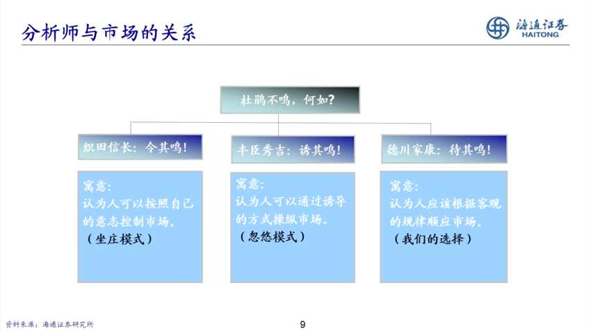 我講這些是不是說(shuō)明市場(chǎng)不可測(cè)了,是隨機(jī)游走,就沒有研究?jī)r(jià)值了呢?也不是?!锻顿Y世界長(zhǎng)期屬于樂觀者-20170710》中我們研究過(guò)各國(guó)/地區(qū)經(jīng)濟(jì)發(fā)展與股市的歷史,最長(zhǎng)歷史數(shù)據(jù)顯示,各個(gè)市場(chǎng)股指年化漲幅基本等于GDP年化名義增速,長(zhǎng)期看,股市上漲90%以上由盈利貢獻(xiàn)。如本杰明·格雷厄姆所言:“市場(chǎng)短期是一臺(tái)投票機(jī),長(zhǎng)期是一臺(tái)稱重機(jī)?!惫墒型顿Y長(zhǎng)期掙的是盈利增長(zhǎng)的錢。那怎么理解分析師與市場(chǎng)的關(guān)系呢?我借用日本戰(zhàn)國(guó)時(shí)期戰(zhàn)國(guó)三英杰對(duì)同一個(gè)問題的不同回答,談?wù)勎业睦斫?。有個(gè)高僧問他們同一個(gè)問題:杜鵑不鳴,當(dāng)如何?這三個(gè)人的答案截然不同,三種境界正好解釋了A股發(fā)展的三段歷程。第一位,織田信長(zhǎng)回答:令其鳴!杜鵑不叫,就用鞭子抽打讓它叫,這好比股市中的坐莊模式,在九十年代非常盛行,甚至出現(xiàn)過(guò)滬深兩地政府為搶奪金融定價(jià)權(quán)主動(dòng)抬高股價(jià),闞治東的《榮辱二十年》對(duì)這段歷史有介紹。第二位,豐臣秀吉回答:誘其鳴!杜鵑不叫,就用食物來(lái)誘導(dǎo)它叫,這類似股市的忽悠模式,通過(guò)報(bào)告、畫K線走勢(shì)圖,引導(dǎo)市場(chǎng)價(jià)格,讓市場(chǎng)形成某個(gè)趨勢(shì)。2005-07年牛市中有一個(gè)炒股大神叫帶頭大哥777,最開始股評(píng)比較準(zhǔn),后來(lái)組建了一個(gè)QQ群,推薦任何的股票第二天都漲停,最后被抓了。第三位,德川家康回答:待其鳴!杜鵑不叫,我就等,只要不是生理上的缺陷,它不可能永遠(yuǎn)不叫。這是我認(rèn)可和堅(jiān)守的原則,分析師的責(zé)任是通過(guò)扎實(shí)的研究給出合理價(jià)值區(qū)間,至于股價(jià)什么時(shí)候達(dá)到這個(gè)位置,會(huì)不會(huì)超漲,超漲多少,由市場(chǎng)的運(yùn)行狀態(tài)、資金、情緒等等因素決定。市場(chǎng)不可能被完全認(rèn)知,只能無(wú)限接近,基本面分析(包括價(jià)值投資、成長(zhǎng)投資)、技術(shù)面分析都是認(rèn)識(shí)市場(chǎng)的一個(gè)角度,找一個(gè)適合自己的方法,認(rèn)識(shí)并接受它的不足,做好自己能力圈內(nèi)的事,這也就是知輕重、懂取舍。