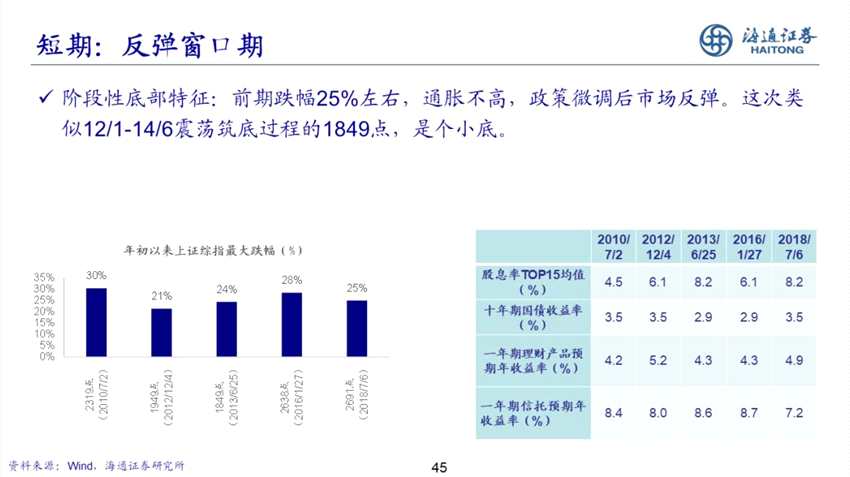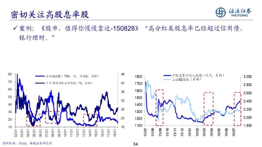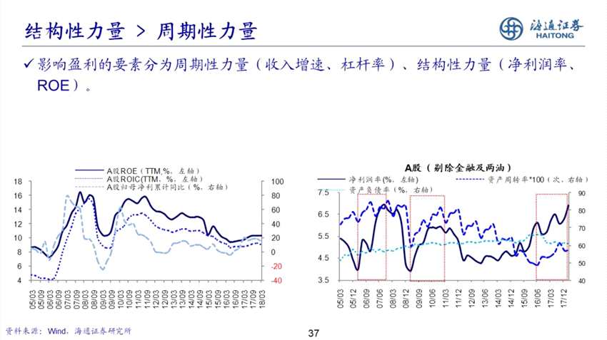 回到DDM模型的三個(gè)變量,第一利率(流動(dòng)性)、第二企業(yè)盈利、第三風(fēng)險(xiǎn)偏好,如何跟蹤分析呢?第一,流動(dòng)性和利率其實(shí)最重要。經(jīng)濟(jì)周期是一個(gè)抽象的名詞,有很多刻畫指標(biāo),就像一個(gè)人,身高、體重、外貌、學(xué)歷、愛好、性格特征等綜合起來(lái)才能全面描述。1776年亞當(dāng)·斯密的《國(guó)富論》到1936年凱恩斯的《通論》之前,經(jīng)濟(jì)是自由放任的,1929-33年大蕭條推動(dòng)了經(jīng)濟(jì)學(xué)的再一次豐富和發(fā)展,宏觀經(jīng)濟(jì)學(xué)應(yīng)運(yùn)而生,有了貨幣政策、財(cái)政政策等宏觀調(diào)控,政府這只有形之手時(shí)不時(shí)干預(yù)經(jīng)濟(jì)。凱恩斯認(rèn)為經(jīng)濟(jì)之所以持續(xù)低迷是因?yàn)橛行枨蟛蛔?,所以要壓低利率刺激有效需求,所以貨幣?huì)先于經(jīng)濟(jì)增長(zhǎng)。流動(dòng)性、經(jīng)濟(jì)增長(zhǎng)、通脹、債務(wù),這四個(gè)指標(biāo)是刻畫經(jīng)濟(jì)周期最重要的維度,而且有領(lǐng)先滯后關(guān)系。流動(dòng)性量的指標(biāo)如M1、M2、社融總量增速、新增信貸,價(jià)的指標(biāo)如存貸款利率、國(guó)債利率、回購(gòu)利率、理財(cái)信托利率。利率會(huì)影響資產(chǎn)輪動(dòng),這張圖是我14年6月24日中期策略報(bào)告《撥云見日》PPT中的,大家都說(shuō)貨幣牛市、債券牛市、股票牛市的輪動(dòng),這種輪動(dòng)有個(gè)過(guò)程。從債券牛市到股票牛市是會(huì)先出現(xiàn)分紅多的高股息率股票先走牛。14年3-6月上證綜指2000點(diǎn)附近,四大國(guó)有行、長(zhǎng)江電力、【上汽集團(tuán)(600104)、股吧】、大秦鐵路等等一批股票股息率已經(jīng)超過(guò)6%,超過(guò)了當(dāng)時(shí)一年期銀行理財(cái)收益率,因此這些股票先于指數(shù)開始漲,這也是我當(dāng)時(shí)看牛市的一個(gè)重要理由。第二,盈利是股市的根基。盈利的指標(biāo)主要有收入同比、凈利潤(rùn)同比、ROE、凈利率、毛利率等。過(guò)去對(duì)企業(yè)盈利的分析,自上而下很有效,GDP同比與各項(xiàng)企業(yè)盈利指標(biāo)相關(guān)性很強(qiáng),那是因?yàn)槲覀兲幵谝粋€(gè)要素投入驅(qū)動(dòng)經(jīng)濟(jì)增長(zhǎng)的模式中,總需求的擴(kuò)張和收縮對(duì)盈利的影響非常明顯,通過(guò)GDP增速可以推導(dǎo)企業(yè)收入增速,通過(guò)CPI、PPI、PPIM可以推導(dǎo)毛利率,通過(guò)利率、稅收等可以推導(dǎo)費(fèi)用。但是在轉(zhuǎn)型期的時(shí)候技術(shù)進(jìn)步,產(chǎn)業(yè)結(jié)構(gòu)調(diào)整等變量作用上升,影響盈利的要結(jié)構(gòu)性力量(凈利潤(rùn)率、ROE)大于周期性力量(收入增速、杠桿率),這是我們一直強(qiáng)調(diào)新時(shí)代的特征就是,宏觀經(jīng)濟(jì)周期波動(dòng)小,中觀產(chǎn)業(yè)結(jié)構(gòu)變化大,企業(yè)盈利受結(jié)構(gòu)因素影響更大。A股的周期性行業(yè),包括有色金屬、煤炭、鋼鐵、水泥、工程機(jī)械、建筑等,他們利潤(rùn)在整個(gè)市場(chǎng)的占比以前最高的時(shí)候接近40%,現(xiàn)在是17%,消費(fèi)和科技占比已達(dá)18%,盈利結(jié)構(gòu)已經(jīng)變化。第三,風(fēng)險(xiǎn)偏好的度量相對(duì)難一點(diǎn),用的比較多的是信用利差、成交量、換手率、基金倉(cāng)位、融資交易占比等。此外,A股中長(zhǎng)期趨勢(shì)取決于以上變量,一年內(nèi)每個(gè)階段的關(guān)注點(diǎn)不同,1-3月:年初通常有春季躁動(dòng),1月底關(guān)注中央一號(hào)文,3月關(guān)注兩會(huì),4月:基本面和政策面更明朗,經(jīng)歷躁動(dòng)后市場(chǎng)進(jìn)入基本面驗(yàn)證期,5-10月:“Sell in May”效應(yīng)源自海外,相比年底年初A股此階段漲幅也偏低,9-12月:關(guān)注黨代會(huì)、**中央全會(huì)和中央經(jīng)濟(jì)工作會(huì)議,年底行情多博弈。