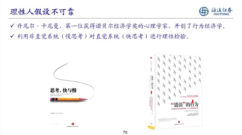 丹尼爾·卡尼曼是第一位獲得諾貝爾經(jīng)濟(jì)學(xué)獎(jiǎng)的心理學(xué)家,他提出經(jīng)濟(jì)學(xué)的理性人假設(shè)不可靠,開創(chuàng)了行為經(jīng)濟(jì)學(xué)?!端伎迹炫c慢》這本書是卡尼曼的代表作,也是行為經(jīng)濟(jì)學(xué)理論的經(jīng)典著作。2017年諾貝爾經(jīng)濟(jì)學(xué)獎(jiǎng)得主,行為經(jīng)濟(jì)學(xué)家理查德·塞勒的《錯(cuò)誤的行為》中舉例分析了,人類現(xiàn)實(shí)生活中的各種經(jīng)濟(jì)行為,受到各種“非理性”因素影響?!端伎?,快與慢》開創(chuàng)性地把人類的思考模式拆分為快思考和慢思考兩個(gè)系統(tǒng),即系統(tǒng)1和系統(tǒng)2。系統(tǒng)1是依賴直覺的、無(wú)意識(shí)的思考系統(tǒng),系統(tǒng)2是需要主動(dòng)控制的、有意識(shí)進(jìn)行的思考系統(tǒng),提出我們應(yīng)該利用系統(tǒng)2(慢思考)對(duì)系統(tǒng)1(快思考)進(jìn)行理性檢驗(yàn)。