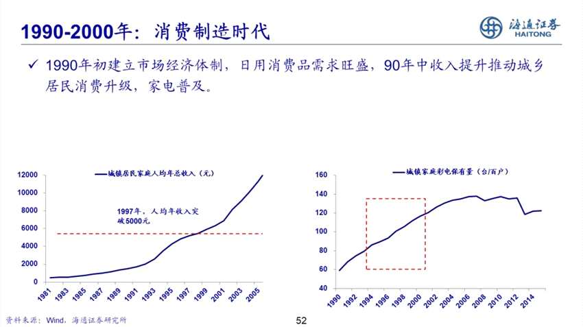 《十年一片天:產(chǎn)業(yè)周期跨越股市牛熊-20160225》中我們分析回顧過(guò)A股歷史,產(chǎn)業(yè)演變可以分成三大波:第一,1990-2000年消費(fèi)制造時(shí)代。1992年年初,鄧小平南巡講話,社會(huì)主義市場(chǎng)經(jīng)濟(jì)地位確立,改革開放速度加快,中國(guó)經(jīng)濟(jì)迎來(lái)快速發(fā)展,GDP同比從90年的3.8%快速提高到10%以上??焖俚慕?jīng)濟(jì)增長(zhǎng)顯著提高了人民的生活水平,全社會(huì)月均消費(fèi)額由91年的687億元增至97年的2275億元。由于此前中國(guó)處于短缺經(jīng)濟(jì)時(shí)代,隨著市場(chǎng)經(jīng)濟(jì)的快速發(fā)展帶來(lái)了人們收入水平提高,消費(fèi)品等百貨商品得到了廣泛青睞。91年到93年牛市漲得最好的就是日用消費(fèi)品的公司,如海立股份、豫園商城、金楓酒業(yè)等。經(jīng)過(guò)市場(chǎng)經(jīng)濟(jì)的初期積累后,居民整體收入水平在90年代出現(xiàn)了明顯提升,1997年人均年總收入突破了5000元大關(guān)。收入提升直接催生了當(dāng)時(shí)城鄉(xiāng)居民的消費(fèi)升級(jí)訴求,在“老三件”(手表、自行車、縫紉機(jī))逐漸普及后,以“新三件”(彩電、冰箱、洗衣機(jī))為代表的家電產(chǎn)品深受消費(fèi)者青睞,成為這一時(shí)期的消費(fèi)主流。以彩電為例,從1990到2001年,城鄉(xiāng)家庭彩電保有量從59臺(tái)/百戶上升到了120臺(tái)/百戶,剛好實(shí)現(xiàn)翻倍。96-01的牛市,家電股成為大牛股。