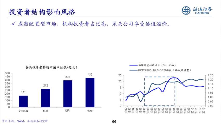 這個(gè)部分我們?cè)儆懻撓率袌?chǎng)風(fēng)格,我們幾篇報(bào)告分析過(guò),宏觀流動(dòng)性、經(jīng)濟(jì)增長(zhǎng)與市場(chǎng)風(fēng)格的關(guān)系不穩(wěn)定,企業(yè)盈利趨勢(shì)及估值匹配才是決定市場(chǎng)風(fēng)格的核心因素,微觀投資者結(jié)構(gòu)會(huì)影響市場(chǎng)風(fēng)格。2017年年初我們提出,2017年上證50=2013年創(chuàng)業(yè)板指。2017年末展望2018年時(shí),我們提出價(jià)值龍頭攜手成長(zhǎng)龍頭,市場(chǎng)風(fēng)格趨于均衡,18年是過(guò)渡年,也是基于對(duì)上證50代表的價(jià)值和創(chuàng)業(yè)板指代表的成長(zhǎng),兩類風(fēng)格的盈利判斷。17年底18年初,市場(chǎng)對(duì)消費(fèi)白馬分歧很大,最大擔(dān)憂是基金重倉(cāng)魔咒,我們當(dāng)時(shí)提出一個(gè)觀點(diǎn),這次基金重倉(cāng)的消費(fèi)白馬不同以前品種,消費(fèi)白馬的主力軍是外資,而外資是邊際增量資金,因此消費(fèi)白馬股不會(huì)出現(xiàn)基金重倉(cāng)魔咒,實(shí)際上半年多過(guò)去了,正是由于外資持續(xù)流入A股,支撐了消費(fèi)白馬的相對(duì)強(qiáng)勢(shì)。展望未來(lái),A股機(jī)構(gòu)化和國(guó)際化的大趨勢(shì)不變,龍頭效應(yīng)會(huì)持續(xù),即無(wú)論價(jià)值還是成長(zhǎng),各行業(yè)的龍頭公司會(huì)享受估值溢價(jià)。