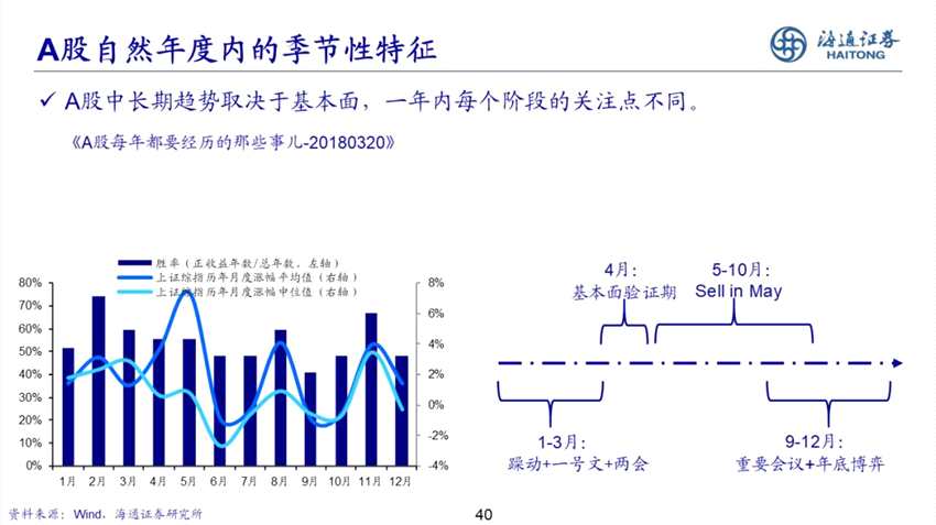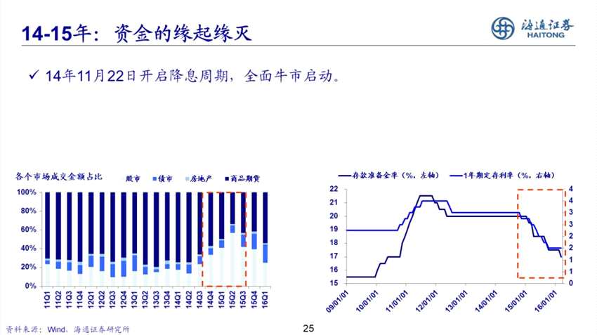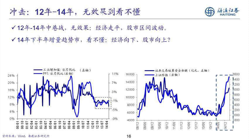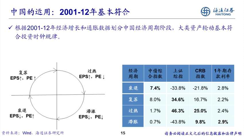 察勢(shì)者智,馭勢(shì)者贏,對(duì)大趨勢(shì)的判斷非常重要?!秾O子兵法》開篇就是《計(jì)篇》,寫到“夫未戰(zhàn)而廟算勝者,得算多也;未戰(zhàn)而廟算不勝者,得算少也。多算勝少算,而況于無(wú)算乎。”簡(jiǎn)單來(lái)說(shuō)的就是,打戰(zhàn)前仔細(xì)算一下,算贏了就打,算不贏千萬(wàn)別打。策略研究本質(zhì)上就是分析贏面大小,主要回答三個(gè)問題:第一買不買?大類資產(chǎn)角度股市值不值得配。第二買什么?就是選擇什么產(chǎn)業(yè),怎么布局?第三有什么熱點(diǎn)、主題?這里面最至關(guān)重要就是要回答買不買的問題,這是一個(gè)0或1的問題。從大類資產(chǎn)配置的角度看股市值不值得投資有一個(gè)非常著名的理論,叫美林投資時(shí)鐘理論。我是2007年入行時(shí)非常癡迷這個(gè)理論,過(guò)去十幾年確實(shí)是一個(gè)非常有效的宏觀策略框架。美林投資時(shí)鐘理論說(shuō)白了就是把宏觀和市場(chǎng)結(jié)合起來(lái),通過(guò)經(jīng)濟(jì)增長(zhǎng)、通脹兩大指標(biāo)把經(jīng)濟(jì)周期劃為復(fù)蘇、過(guò)熱、滯漲、衰退四個(gè)區(qū)間,指出股票、大宗商品、現(xiàn)金、債券四大類資產(chǎn)依次占優(yōu)。這個(gè)框架有美國(guó)1973-2004年的歷史驗(yàn)證,曾經(jīng)在中國(guó)也運(yùn)用的有效。根據(jù)2001-2012年數(shù)據(jù)劃分中國(guó)經(jīng)濟(jì)周期階段,大類資產(chǎn)輪動(dòng)基本符合投資時(shí)鐘規(guī)律。能解釋2005到07年牛市,也能解釋08年的熊市,還能解釋08年底到09年的小牛市及11年的熊市,所以這個(gè)理論那幾年宏觀策略分析師開口閉口都談美林時(shí)鐘。但是2012年之后問題就出現(xiàn)了,這個(gè)框架變得很難用了,因?yàn)槊懒滞顿Y時(shí)鐘理論的抓手就是經(jīng)濟(jì)周期的波動(dòng),在經(jīng)濟(jì)周期的波動(dòng)中有不同的階段和不同的區(qū)間,但是從2012年之后就發(fā)現(xiàn)經(jīng)濟(jì)周期波動(dòng)很小,是一條直線,波動(dòng)都沒有又如何能劃區(qū)間呢?區(qū)間劃不出來(lái)又如何指導(dǎo)投資呢?又如何去分析市場(chǎng)呢?不僅無(wú)效,到了2014下半年,如果用這個(gè)理論分析得出的結(jié)論甚至是錯(cuò)誤的,因?yàn)?4年下半年經(jīng)濟(jì)增長(zhǎng)緩慢往下降,通脹也不行,PPI是負(fù)的,但是股市是一波很猛烈的大牛市,這讓很多人彷徨了。