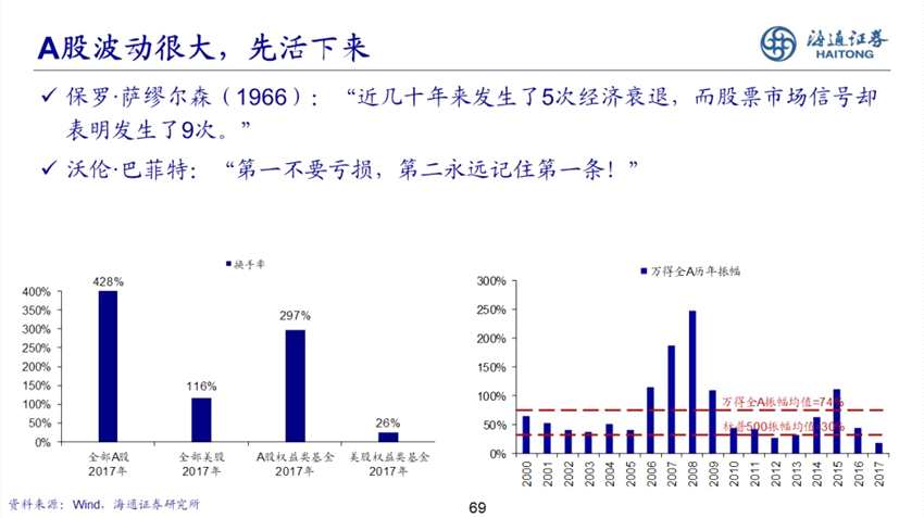如果說(shuō)辨識(shí)大勢(shì)和選擇產(chǎn)業(yè)時(shí),我們需要做到知輕重,抓主要變量,聚焦大概率事件,那么這部分我們要討論的就是懂取舍,即守護(hù)好能力圈,在做選擇時(shí),不做什么和做什么一樣重要。對(duì)比A股和美股,我們可以看到,A股的波動(dòng)率明顯大很多,2000年以來(lái)萬(wàn)得全A指數(shù)年振幅均值74%,標(biāo)普500為30%,2017年A股換手率428%,美股為116%,A股股票型公募基金換手率為297%,美股為26%。保羅·薩繆爾森在1966年就曾經(jīng)說(shuō)過(guò)“近幾十年來(lái)發(fā)生了5次經(jīng)濟(jì)衰退,而股票市場(chǎng)信號(hào)確表明發(fā)生了9次?!比绶旁贏股,次數(shù)可能會(huì)更多。A股還很年輕,如果美股類似35-40歲的中青年,A股可能類似13-18歲的青少年,情緒波動(dòng)更大,市場(chǎng)的波動(dòng)比基本面的波動(dòng)大的多得多,如果不做好過(guò)程管理,有可能倒在黎明前。沃倫·巴菲特教導(dǎo)我們“第一不要虧損,第二永遠(yuǎn)記住第一條!”在波動(dòng)大的A股市場(chǎng)尤為重要。
