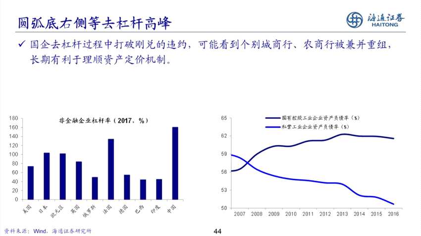 結(jié)合分析框架我們談?wù)劗?dāng)下的市場(chǎng),1990年以來(lái)A股經(jīng)歷五輪牛熊周期,只有08年10月的1664點(diǎn)是尖底,那時(shí)內(nèi)外影響共振,上證綜指1年跌幅就達(dá)73%,全球金融危機(jī)爆發(fā)后國(guó)內(nèi)刺激內(nèi)需的政策非常強(qiáng),最終形成了V型反轉(zhuǎn),其他幾次都是圓弧底。我們把2016年1月底上證綜指2638點(diǎn)以來(lái)的市場(chǎng),定性為箱體震蕩的大圓弧底,類似于94/7-96/1、02/1-05/6、12/1-14/6,市場(chǎng)在震蕩過(guò)程中估值水平不斷下移,以時(shí)間換空間,形成中長(zhǎng)期的圓弧底。這次圓弧底的打磨仍需時(shí)間,宏微觀基本面自16年2季度來(lái)已經(jīng)見底企穩(wěn),但是去杠桿背景下資金供求一直緊張,圓弧底右側(cè)即新一輪牛市要等去杠桿高峰過(guò)去,資金供求關(guān)系出現(xiàn)拐點(diǎn)。BIS數(shù)據(jù)顯示2017年我國(guó)整體杠桿率255.7%,低于日本373.1%、英國(guó)283.3%、歐元區(qū)258.3%,與美國(guó)251.2%接近。總量看我國(guó)杠桿率不算高,但結(jié)構(gòu)性問題顯著,非金融企業(yè)部門杠桿率明顯偏高,我國(guó)160.3%,日本103.4%、歐元區(qū)101.6%、英國(guó)83.8%、美國(guó)73.5%。其中國(guó)企尤其是地方國(guó)企杠桿率最高,未來(lái)去杠桿的高峰很可能是地方城投平臺(tái)杠桿率下降,這意味著結(jié)構(gòu)性去杠桿取得實(shí)質(zhì)成效,資金面或迎來(lái)轉(zhuǎn)折點(diǎn)。短期反彈是市場(chǎng)在圓弧底過(guò)程中出現(xiàn)階段性見底反彈,可定性為戰(zhàn)術(shù)性反彈,類似12/1-14/6中的2013年6月25日1849點(diǎn)后的反彈。未來(lái)市場(chǎng)向上超預(yù)期的可能因素是國(guó)內(nèi)大力推進(jìn)改革,這需要觀察10月左右將召開的聚焦經(jīng)濟(jì)改革的十九屆四中全會(huì),市場(chǎng)向下超預(yù)期的可能因素是中美貿(mào)易摩擦再次惡化。
