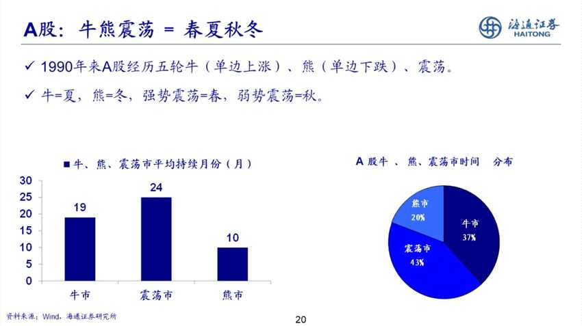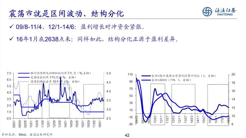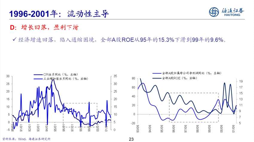 回顧A股歷史,1984年就有股票了,【飛樂音響(600651)、股吧】是第一支股票,1986年開始有股票交易,1988年最早一批證券公司成立,海通證券是其中之一,也是所有證券公司中唯一沒有更名保存至今的證券公司,1990年上海證券交易所成立到現(xiàn)在總共27年,經(jīng)常有人問我現(xiàn)在是熊市還是牛市?有時(shí)我很難回答,我自己一直把A股市場(chǎng)的牛熊周期劃分成三種狀態(tài):?jiǎn)芜吷蠞q稱為牛市,單邊下跌稱為熊市,還有種狀態(tài)是區(qū)間波動(dòng),我們稱為震蕩市,牛市好比夏天,很火熱很火爆,熊市就好比冬天,很寒冷很蕭條,震蕩市好比春秋天,溫度比較適宜,偏強(qiáng)的震蕩類似春天,偏弱的震蕩類似秋天。有人說(shuō)A股是牛短熊長(zhǎng),我認(rèn)為這是一個(gè)誤讀,簡(jiǎn)單地把A股理解為非牛即熊、非黑即白了,其實(shí)還有一個(gè)非黑非白的灰色地帶,這就是震蕩市。把震蕩式單獨(dú)挑出來(lái)的話,這個(gè)時(shí)間占比非常大,達(dá)43%。那么為什么要這么劃分?好比天氣,預(yù)測(cè)未來(lái)幾天的氣溫非常難,出錯(cuò)概率很高,但是做一年四季春夏秋冬的預(yù)測(cè),正確的概率就非常高。這就是巴菲特說(shuō)的模糊正確,這很重要,市場(chǎng)環(huán)境決定投資策略,冬天的時(shí)候一定要準(zhǔn)備棉襖羽絨服,夏天的時(shí)候要準(zhǔn)備短袖短褲裙子,春秋只要準(zhǔn)備搭外套就可以了,牛市保持高彈性不輕易擇時(shí),熊市追求安全不輕易做反彈,震蕩市業(yè)績(jī)?yōu)橥?,不死多不死空?990年開始有交易所、有了上證綜指,到現(xiàn)在A股經(jīng)歷了五輪牛熊震蕩。1990-93年的牛市,那時(shí)市場(chǎng)還比較小,代表性差一點(diǎn)。1996年到2001年是一個(gè)很典型的流動(dòng)性驅(qū)動(dòng)的牛市。1996年開始經(jīng)濟(jì)下行壓力出現(xiàn),央行開始降息,一年期存款利率從1996年初的10.98%降至2002年1.98%,并一直維持到2004年。其實(shí)1996-2001年基本面不好,全部A股ROE從95年的15.3%下滑到99年的9.6%。當(dāng)時(shí)的牛市主要靠貨幣寬松,當(dāng)然也有制度上的利好,當(dāng)時(shí)上海和深圳政府為了搶奪金融市場(chǎng)定價(jià)權(quán),行政指導(dǎo)證券公司做活交易。2014-15年的牛市與96-01年牛市很像,是典型的流動(dòng)性主導(dǎo)的牛市,俗稱水牛,14年11月22日開啟降息周期,全面牛市啟動(dòng),一年期存款利率從3%降至1.5%,宏觀流動(dòng)性寬松的背景下,股市創(chuàng)新不斷,融資業(yè)務(wù)快速發(fā)展,場(chǎng)內(nèi)融資余額從14年中4000億左右快速升至15年高峰的2.27萬(wàn)億,杠桿交易加速了市場(chǎng)的上漲。14年中到15年中GDP同比從7.5%緩慢回落至7%,上市公司ROE從13%緩慢回落至11.6%。最終15年6月監(jiān)管層開始清理場(chǎng)外配資,股市微觀流動(dòng)性惡化,迎來(lái)大跌。2005年到2007年上證綜指從998點(diǎn)漲到6124點(diǎn),就是因?yàn)榱鲃?dòng)性環(huán)境偏松和經(jīng)濟(jì)增長(zhǎng)推升盈利兩大條件一起出現(xiàn),疊加股權(quán)分置改革的制度因素,出現(xiàn)了大牛市。05-07年M2同比維持在16%以上,銀行間7天回購(gòu)利率在3%以下。GDP同比從05年中的11%,上升到07年2季度的高點(diǎn)15%,全部A股剔除金融的ROE上升到07年4季度的16.5%。之后6124點(diǎn)跌到1664點(diǎn),源于國(guó)內(nèi)通脹高企后流動(dòng)性緊縮和全球金融危機(jī)拖累經(jīng)濟(jì),內(nèi)外交困之下出現(xiàn)了大熊市。08年11月到09年8月的牛市是迷你版的2005到07年,只是這次經(jīng)濟(jì)復(fù)蘇更多源于政策的強(qiáng)刺激,即四萬(wàn)億投資及十萬(wàn)億信貸,2008年9月開始五次降息,M2同比大幅回升至30%,GDP同比從6.4%的低點(diǎn)回升至12%,上市公司ROE從10%回升至16%。