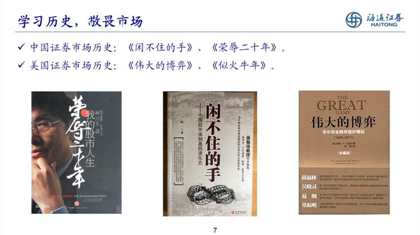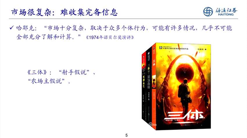 20世紀(jì)最偉大的經(jīng)濟(jì)學(xué)家之一哈耶克在1974年獲得諾貝爾經(jīng)濟(jì)學(xué)獎(jiǎng)時(shí),就發(fā)言指出“市場(chǎng)是十分復(fù)雜的,取決于眾多個(gè)體行為,結(jié)果的過(guò)程可能有許多情況,幾乎不可能全部充分了解和計(jì)算?!惫说莱隽松鐣?huì)科學(xué)與自然科學(xué)的本質(zhì)差異。自然科學(xué)研究物的行為和規(guī)律,數(shù)學(xué)由公式推導(dǎo)可以得出定理,物理、化學(xué)通過(guò)在實(shí)驗(yàn)室里做實(shí)驗(yàn)可以得出一個(gè)理論。社會(huì)科學(xué)研究人的行為,通過(guò)對(duì)社會(huì)現(xiàn)象歸納總結(jié),提煉出一些理論,1776年亞當(dāng)·斯密寫《國(guó)富論》這本書開始,經(jīng)濟(jì)學(xué)才成為一門社會(huì)科學(xué),到現(xiàn)在也不過(guò)才240多年。市場(chǎng)的復(fù)雜性就在于要研究人,很難收集完備信息,比如A股有1億股民,我們經(jīng)常提到市場(chǎng)的一致預(yù)期,其實(shí)這是一個(gè)非常模糊的詞,我們不可能把所有投資者的觀點(diǎn)都調(diào)查清楚,哪來(lái)的一致預(yù)期呢?復(fù)盤之所以重要,其實(shí)是通過(guò)市場(chǎng)本身的交易指標(biāo)觀察市場(chǎng)到底在演繹什么,投資者在想什么。2015年有一部非常著名的科幻小說(shuō)《三體》,里面講了兩個(gè)假設(shè), “射手假說(shuō)”和“農(nóng)場(chǎng)主假說(shuō)”,或許能給我們一些啟示。射手假說(shuō)講的是,一個(gè)神槍手對(duì)一個(gè)靶子每隔十厘米打一槍,很多槍之后,設(shè)想這個(gè)靶子的平面上生活著一種二維生物,比如螞蟻,螞蟻中的哲學(xué)家通過(guò)觀察發(fā)現(xiàn)一個(gè)偉大的定律:它們的宇宙每隔十厘米有一個(gè)黑洞。農(nóng)場(chǎng)主假說(shuō)講的是,一個(gè)農(nóng)場(chǎng)里有一群火雞,農(nóng)場(chǎng)主每天中午11點(diǎn)給火雞喂食,火雞中的哲學(xué)家于是高呼他發(fā)現(xiàn)了真理:每天中午11點(diǎn)會(huì)天降食物,結(jié)果有天中午11點(diǎn)農(nóng)場(chǎng)主把火雞都抓去宰了,那天是感恩節(jié)。螞蟻哲學(xué)家和火雞哲學(xué)家得出的真理,在我們?nèi)祟惪磥?lái)很可笑,四維、五維或更高維的智能生物在看人類總結(jié)的一些真理時(shí),是否也會(huì)類似感受呢?市場(chǎng)的復(fù)雜性還在于,參與市場(chǎng)的主體是人,不同的人對(duì)同一個(gè)信息的理解常常不同。我們看看這兩張圖(見PPT第6頁(yè)),左邊這個(gè)圖,我相信大家第一感觀是,離我們近的這條黃線更短,實(shí)際上兩條黃線一樣長(zhǎng),錯(cuò)覺源于背景圖的干擾。右邊這個(gè)圖是什么動(dòng)物?既可以看成鴨子也可以看成兔子,取決于你分析信息的角度。我們?cè)诠墒兄薪?jīng)常碰到類似的現(xiàn)象:一個(gè)政策出臺(tái)后,有人解讀為大利好,有人解讀為大利空。所以說(shuō)市場(chǎng)很復(fù)雜,市場(chǎng)包含的信息很多,而人對(duì)信息的理解和分析、得到的結(jié)論也不一樣。學(xué)習(xí)歷史會(huì)讓我們更敬畏市場(chǎng),推薦兩本介紹中國(guó)證券市場(chǎng)歷史的書,《閑不住的手》、《榮辱二十年》,介紹美國(guó)證券市場(chǎng)歷史的書有《偉大的博弈》和《似火牛年》。