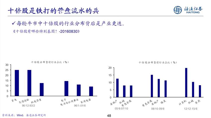 最后,我想強(qiáng)調(diào)一下,研究和投資要與時(shí)俱進(jìn),所謂“兵無(wú)常勢(shì),水無(wú)常形”。大家都喜歡膜拜美國(guó)的投資大師,因?yàn)閹装倌陙?lái)證券史中美國(guó)資本市場(chǎng)是最發(fā)達(dá)、最成功的。美國(guó)1896年才有道瓊斯指數(shù),真正的基本面研究起源于1934年格雷厄姆的《證券分析》,之前的股市更多是交易而非投資,最出名的大師是利弗莫爾。仔細(xì)看美股過(guò)去100多年歷史,從格林厄姆到費(fèi)雪,到巴菲特,到彼得·林奇,到比爾·米勒,會(huì)發(fā)現(xiàn)一個(gè)很有意思的現(xiàn)象,他們成名的年代都不一樣,成名的代表作也不一樣,也就是說(shuō)大師是一茬一茬的。這是因?yàn)闀r(shí)代背景不一樣,投資是順勢(shì)而為,順大勢(shì)方能成大器。在不同時(shí)代要弄明白不同的背景,在這種背景之下什么樣的行業(yè),什么樣的公司勝出,抓住這些行業(yè)、這些公司就成功了,所以時(shí)勢(shì)造英雄。