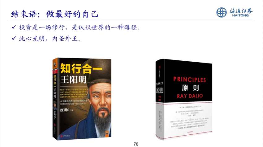 長(zhǎng)期而言,投資最終是一種信仰,從知道到相信到信仰,投資是認(rèn)知的變現(xiàn)。信仰是橋上的欄桿,走過(guò)的時(shí)候不用扶,可是沒有它會(huì)害怕。青澤的《澄明之鏡》里有討論了投資心法,比他十二年前的《十年一夢(mèng)》更深刻,之前寫術(shù),現(xiàn)在寫道。《跳著踢踏舞去上班》中巴菲特說(shuō)“我跳著踢踏舞去上班”,這是多美好的工作狀態(tài)啊。雖然巴菲特曾多次被質(zhì)疑,但是他堅(jiān)持做自己擅長(zhǎng)的事,投自己看得懂的公司,最終取得了非凡的業(yè)績(jī),他的成功和快樂源于堅(jiān)持自己的信仰,懂得取舍。不單純投資如此,其他行業(yè)似乎也如此。讀稻盛和夫的《京瓷哲學(xué)》、李昌鎬的《不得貪勝》都很有感觸,成功的人都有特別之處,所有的勝利都是價(jià)值觀的勝利。李昌鎬的不得貪勝與巴菲特的不要虧損,蘊(yùn)含的哲理類似,控制欲望、拒絕誘惑,做好能力圈內(nèi)的事。稻盛和夫創(chuàng)辦兩家進(jìn)入世界500強(qiáng)的企業(yè),他提出:人生/工作的結(jié)果=思維方式*熱情*能力,其中思維方式尤為關(guān)鍵,存在正負(fù)值,可以從-100到+100,這與王陽(yáng)明的心即理類似,所謂萬(wàn)物由心生、萬(wàn)法由心造。最后推薦王陽(yáng)明的《知行合一》,人生是心境的反映,做研究和投資是一場(chǎng)修行,做最好的自己,此心光明、內(nèi)圣外王!