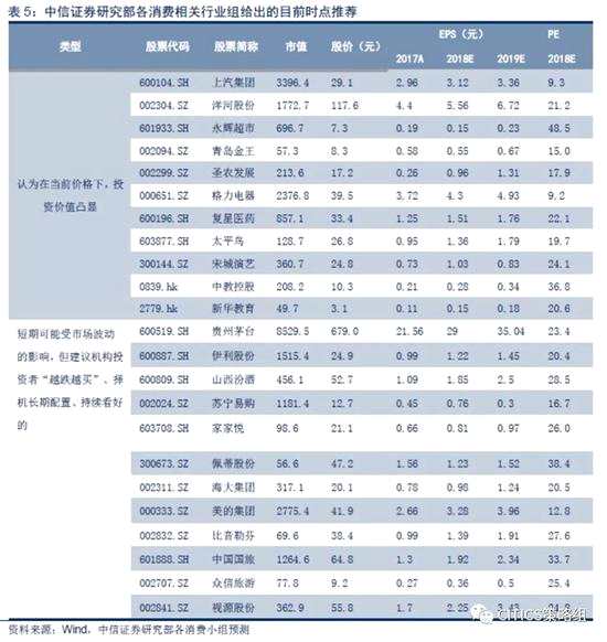 我們也整理了中信證券研究部各消費(fèi)組給出的目前時(shí)點(diǎn)的推薦,供投資者參考: