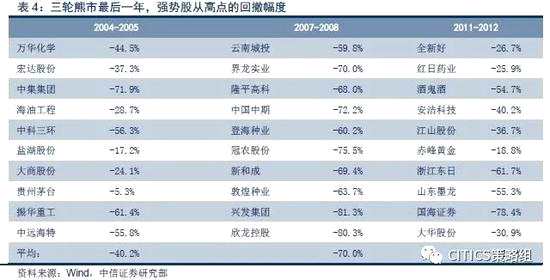 2)強(qiáng)勢(shì)股從高點(diǎn)回撤的幅度超過(guò)40%。我們計(jì)算了三輪熊市最后一年中前三個(gè)季度漲幅最大的前10支股票,從最后一年高點(diǎn)到熊市最后一天的平均跌幅,2004-2005、2007-2008、2011-2012三輪熊市尾聲,強(qiáng)勢(shì)股從高點(diǎn)回撤的幅度分別為-40.2%、-70.0%、-42.9%。