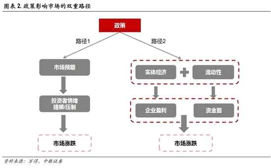 政策影響市場具有雙重路徑。政策影響市場具有雙重路徑。  第一條路徑是直接路徑,對市場短期變化影響較大。根據(jù)我們之前的報告《一致預(yù)期、不一致預(yù)期與短期資產(chǎn)價格走勢》,如果事件發(fā)生時,投資者形成了一致預(yù)期,那么我們要考慮投資者的一致預(yù)期和事件本身的結(jié)果是不是一樣的。如果事件結(jié)果和預(yù)期是一樣的,即是符合預(yù)期的,事件發(fā)生時基本不會影響資產(chǎn)價格走勢。如果是不一樣的,那么資產(chǎn)價格就會形成較大的波動。如果事件結(jié)果超出市場預(yù)期,對宏觀有利的事件,則會按照擴大總需求/降低總供給的模式去驅(qū)動股票上漲、大宗上漲、債券下跌,對宏觀不利的事件,則會按照降低總需求/擴大總供給的模式去驅(qū)動股票下跌、大宗下跌、債券上漲,因為資產(chǎn)價格對事件沒有充分反應(yīng)。如果事件結(jié)果是低于預(yù)期的,雖然是對宏觀有利的事件,也會驅(qū)動股票和大宗下跌、債券上漲,雖然是對宏觀不利的事件,也會驅(qū)動股票和大宗上漲、債券下跌,因為事件已經(jīng)提前并過度反應(yīng)在價格中,市場需要對過度反應(yīng)進(jìn)行糾正。這就是政策影響市場的第一條路徑——情緒路徑。這條路徑是大部分投資者熟悉的路徑。但是政策影響市場的路徑不僅如此,除了情緒這條直接路徑外,政策還可以通過各種間接路徑影響市場。