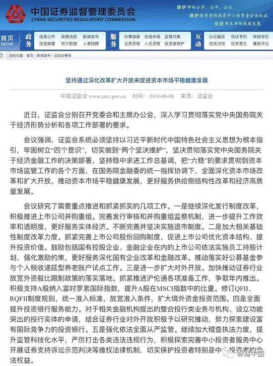 這是證監(jiān)會(huì)在學(xué)習(xí)了國務(wù)院常委會(huì)、中央政治局最新精神后,在資本市場監(jiān)管工作的逐條落實(shí),最關(guān)鍵的是“穩(wěn)金融、穩(wěn)市場和穩(wěn)預(yù)期”,當(dāng)前的主要任務(wù)就是全面深化資本市場改革和擴(kuò)大開放,推動(dòng)資本市場平穩(wěn)健康發(fā)展。