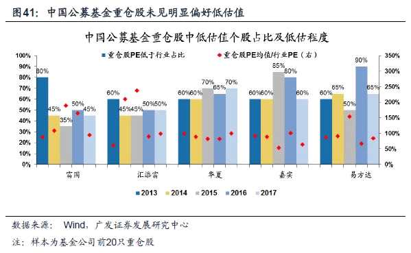 而A股基金呈現(xiàn)出更加“偏愛(ài)低估值”的特征。以A股規(guī)模最大的基金公司為例,13-17年基金重倉(cāng)股中低估值公司的占比更加顯著,且重倉(cāng)股PE相比行業(yè)PE的折價(jià)幅度在擴(kuò)大。可見(jiàn)A股“以龍為首”的風(fēng)格體現(xiàn)在更偏愛(ài)低估值的龍頭股。