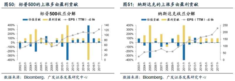 我們對(duì)美股市場(chǎng)指數(shù)的股價(jià)上漲結(jié)構(gòu)進(jìn)行拆分,發(fā)現(xiàn)美股慢牛大部分年份都由盈利驅(qū)動(dòng)、而非估值驅(qū)動(dòng)。除07-08與15-16兩次業(yè)績(jī)下滑期,盈利對(duì)標(biāo)普500上漲的貢獻(xiàn)均明顯高于估值的貢獻(xiàn)。03-18年以來(lái),納指EPS持續(xù)抬升驅(qū)動(dòng)納指慢牛,上漲基本由盈利貢獻(xiàn)。