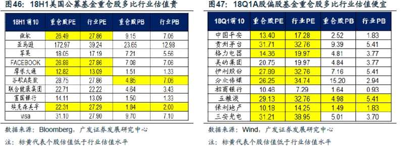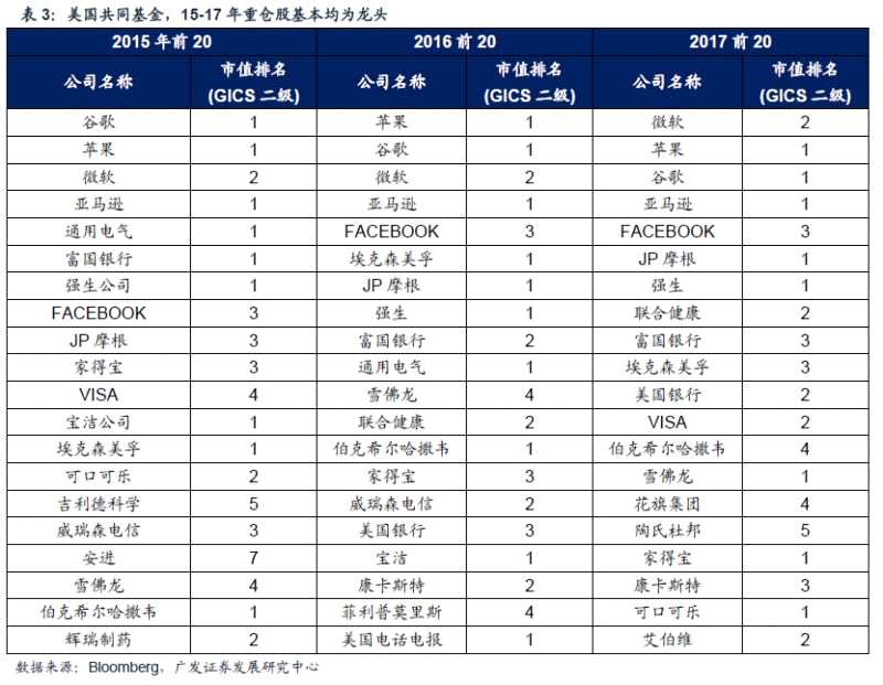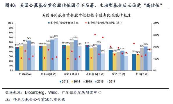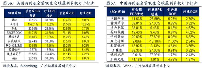 在盈利驅(qū)動(dòng)的美股,基金偏愛(ài)的重倉(cāng)股大多都有“業(yè)績(jī)溢價(jià)”。美國(guó)基金重倉(cāng)股大多盈利好于行業(yè)平均水平,不限于業(yè)績(jī)?cè)鏊?、還包括ROE、業(yè)績(jī)穩(wěn)定性等。美國(guó)基金公司13-17年基本超過(guò)7成的公司ROE勝過(guò)行業(yè)整體,且ROE相比行業(yè)的溢價(jià)程度逐年上升,可見(jiàn)重倉(cāng)股多數(shù)都是盈利能力相比行業(yè)更優(yōu)的公司。