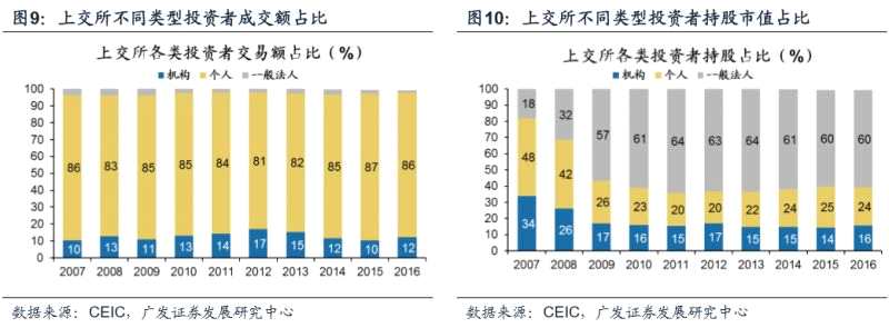 上交所口徑,從成交額占比,A股個(gè)人投資者交易換手高,個(gè)人投資者貢獻(xiàn)八成以上成交額;從持股市值角度,剔除一般法人,A股市場(chǎng)機(jī)構(gòu)與個(gè)人投資者比重約為4:6,總體來(lái)看機(jī)構(gòu)投資者持股占比依然不高。