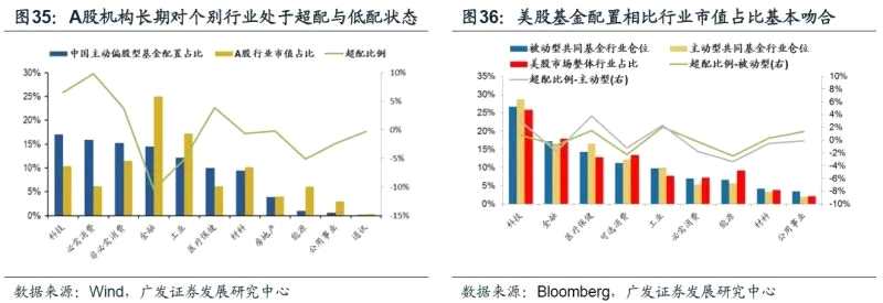 而美國(guó)公募基金對(duì)各行業(yè)的配置池基本接近行業(yè)的市值占比。美國(guó)的被動(dòng)型基金公司(先鋒、貝萊德、道富)對(duì)各行業(yè)的配置比例接近美股行業(yè)市值占比,與指數(shù)化投資風(fēng)格相關(guān)。但進(jìn)一步考察美國(guó)的主動(dòng)型基金公司(富達(dá)、美國(guó)資本、普信),其行業(yè)配置也非常接近美股行業(yè)市值占比,超配與低配幅度不超過(guò)3%。