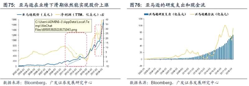 而另一個(gè)科技股龍頭代表公司亞馬遜卻并非依靠盈利驅(qū)動(dòng),由于亞馬遜通過(guò)兼并收購(gòu)不斷擴(kuò)張,因此盈利增長(zhǎng)并不突出,股價(jià)上漲主要依靠估值抬升,而投資者對(duì)于業(yè)績(jī)虧損的容忍度來(lái)自于高資本開(kāi)支及高現(xiàn)金流。從“科網(wǎng)泡沫”破滅以后,亞馬遜就再不斷通過(guò)兼并收購(gòu)實(shí)現(xiàn)全球化的規(guī)模擴(kuò)張以及多層次的業(yè)務(wù)布局,2011年以來(lái)是亞馬遜股價(jià)上漲最快的階段,但由于資本開(kāi)支的不斷加大,亞馬遜的業(yè)績(jī)反而不斷負(fù)增長(zhǎng)。投資者對(duì)于亞馬遜虧損時(shí)期仍然賦予高估值,來(lái)自于對(duì)高額研發(fā)開(kāi)支和投入而產(chǎn)生的盈利折損容忍度較高,18年亞馬遜的研發(fā)支出持續(xù)抬升突破60億美元,且擁有充沛的現(xiàn)金流,體現(xiàn)了“自我造血”的能力。