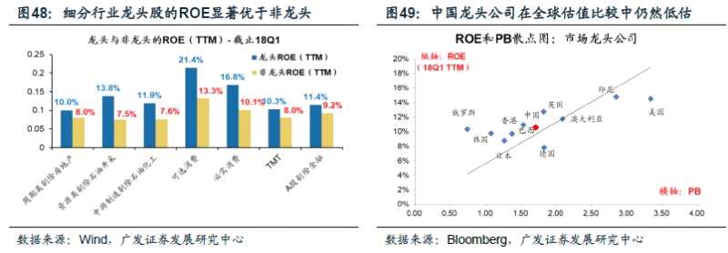 A股龍頭公司已經(jīng)具備“業(yè)績(jī)確定性溢價(jià)”,而兌現(xiàn)至“估值溢價(jià)”卻并不顯著,體現(xiàn)在A股的“龍頭股”更便宜。去杠桿、緊信用,龍頭公司具備更穩(wěn)健經(jīng)營(yíng)杠桿、更充沛現(xiàn)金流,業(yè)績(jī)“馬太效應(yīng)”進(jìn)一步放大,因此A股大類(lèi)板塊的龍頭股相比非龍頭公司的ROE具備顯著的“業(yè)績(jī)溢價(jià)”。而A股大多數(shù)行業(yè)的龍頭相比非龍頭卻是“折價(jià)狀態(tài)”。