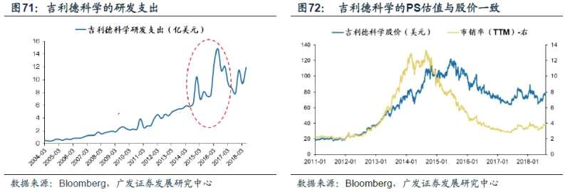 美股對(duì)于未實(shí)現(xiàn)穩(wěn)定盈利的成長(zhǎng)股(導(dǎo)入期),更加重視研發(fā)支出(收入穩(wěn)態(tài)前)和營(yíng)業(yè)收入(收入穩(wěn)態(tài)后)。通常成長(zhǎng)股在導(dǎo)入期能夠?qū)崿F(xiàn)初步市場(chǎng)開(kāi)拓和盈利,但該階段盈利并不穩(wěn)定, 因此在導(dǎo)入期參與成長(zhǎng)股投資時(shí),美股投資人對(duì)市場(chǎng)空間和營(yíng)業(yè)收入的重視程度更高,而對(duì)為保持成長(zhǎng)性而進(jìn)行高額投資從而產(chǎn)生虧損的模式接受度較高。以吉利德科學(xué)為例,市場(chǎng)空間較為確定的產(chǎn)品,股價(jià)上漲節(jié)奏跟隨研發(fā)進(jìn)度,在14-16年研發(fā)投入飆升也是股價(jià)上行最快的時(shí)期。而隨著銷(xiāo)售收入進(jìn)入穩(wěn)態(tài),股價(jià)開(kāi)始印證P/S估值。
