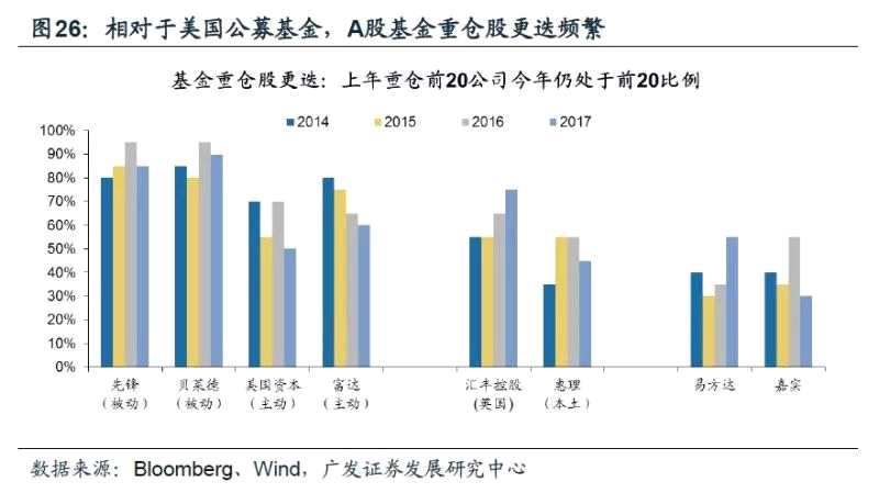 公募基金重倉(cāng)股更迭行為與市場(chǎng)活躍度相關(guān)。我們對(duì)比了考察的中美港股8個(gè)代表基金公司14-17年的重倉(cāng)股更迭情況,美股基金公司很少更換重倉(cāng)股(主動(dòng)相比被動(dòng)更有換倉(cāng)調(diào)整沖動(dòng)),而A股的基金公司重倉(cāng)股更迭最頻繁,次年重倉(cāng)股前20還在列的公司不足50%。港股基金公司介于兩者之間。