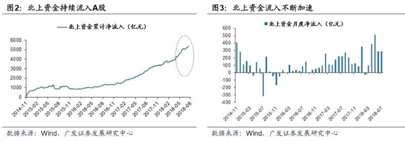 北上資金18年以來(lái)延續(xù)加速流入A股的態(tài)勢(shì),且暫時(shí)未受到本輪人民幣貶值的影響。2017年北上資金凈流入近2000億元,比此前三年總和還多,而2018年北上資金進(jìn)一步加速流入,今年前七個(gè)月北上資金累計(jì)凈流入1789億元,同比增加50%。18年4月19日至8月3日,人民幣對(duì)美元匯率貶值8.4%,但期間北上資金累計(jì)凈流入1155億元,同比增長(zhǎng)57%,加速增長(zhǎng)態(tài)勢(shì)明顯,暫時(shí)未受到匯率貶值的影響。