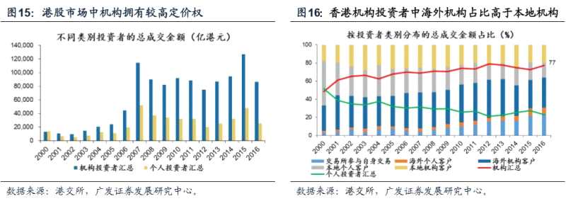 港交所僅披露成交量占比數(shù)據(jù)。可以看出港股交易由海外投資人占據(jù)主導(dǎo),機(jī)構(gòu)投資者占成交量比重較高,近十年來(lái)穩(wěn)定在75%-80%水平。從交易占比看,港股機(jī)構(gòu)投資者交易額占比從2000年的66%持續(xù)上升到2016年的77%。而在機(jī)構(gòu)投資人當(dāng)中,海外機(jī)構(gòu)貢獻(xiàn)占比多數(shù)(近十年平均占比38%),高于本地機(jī)構(gòu)投資人(近十年平均占比22%)。
