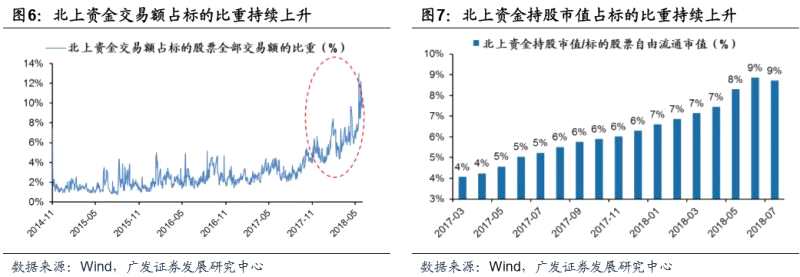 17年以來(lái),北上資金對(duì)可投資標(biāo)的的持股市值占比、交易額占比均出現(xiàn)顯著上升,海外資金對(duì)可投資標(biāo)的的邊際定價(jià)權(quán)上升。一方面,北上資金對(duì)可投資標(biāo)的交易額占比顯著上升,北上資金占標(biāo)的股票交易額的比重自2017年下半年快速上行,從2%增長(zhǎng)至10%以上;另一方面,北上資金對(duì)可投資標(biāo)的的持股市值占比也顯著上升,我們以北上持股規(guī)模最高的前100只股票作為研究樣本,北上資金持股市值占股票自由流通市值的比重快速提升。2017年3月底這一比例僅為4%,至18年7月提升至9%。