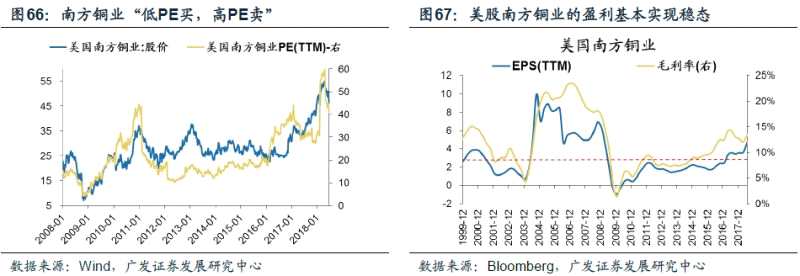 此外,從海外周期股的估值與股價(jià)相關(guān)性來(lái)看,股價(jià)與估值擬合度高,呈現(xiàn)出“低PE買(mǎi),高PE賣(mài)”的特征,來(lái)自于海外周期股行業(yè)集中度大幅提升后已處于寡頭壟斷格局,龍頭公司的盈利呈現(xiàn)穩(wěn)態(tài),周期波動(dòng)下降。我們選取美股最大的周期股龍頭公司,紐柯鋼鐵及南方銅業(yè)為例,股價(jià)與估值的趨勢(shì)基本一致。因此股價(jià)上漲時(shí)估值往往處于相對(duì)低位,股價(jià)下跌時(shí)估值往往處于相對(duì)高位。再次印證美股的周期股是投資于“基本面拐點(diǎn)”,盈利穩(wěn)態(tài)下估值擴(kuò)張帶來(lái)股價(jià)上漲。