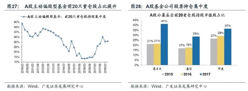A股機(jī)構(gòu)投資者博弈“相對(duì)收益”且年度考核,持股集中度比海外較高;近幾年A股持股風(fēng)格高度趨同,持股集中度進(jìn)一步上升。16年以來(lái)A股公募基金持股風(fēng)格日漸趨同,主動(dòng)偏股型基金持倉(cāng)最重的前20只股票占股票總市值的比重從13%持續(xù)攀升至31%。我們進(jìn)一步以規(guī)模最大的A股基金公司為例,前20重倉(cāng)股的持股集中度自15年逐年上升,17年幾家代表基金公司TOP20的持股集中度在30%-40%之間。
