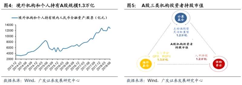 當(dāng)前外資持有A股規(guī)模約1.3萬(wàn)億,與A股公募基金、保險(xiǎn)公司的持股規(guī)模相當(dāng),已成為不可忽視的資金力量,外資在潛移默化中逐漸改變A股的生態(tài)。根據(jù)央行公布數(shù)據(jù),截至18年6月外資持倉(cāng)A股約1.28萬(wàn)億元。外資持股主要包括三部分,陸港通北上資金、QFII和RQFII。其中北上資金持倉(cāng)約6800億元,QFII、RQFII等其他外資持股合計(jì)持股約6000億元。截止6月末,國(guó)內(nèi)主動(dòng)型公募基金(包括主動(dòng)偏股型和靈活配置型)對(duì)A股的持股規(guī)模為1.2萬(wàn)億元,而保險(xiǎn)公司持有的股票規(guī)模約1.2萬(wàn)億??梢?jiàn),海外資金、公募基金和保險(xiǎn)資金已構(gòu)成A股機(jī)構(gòu)投資者最重要的三股力量??紤]到A股納入MSCI之后,北上資金加速流入A股,外資力量將進(jìn)一步擴(kuò)大。