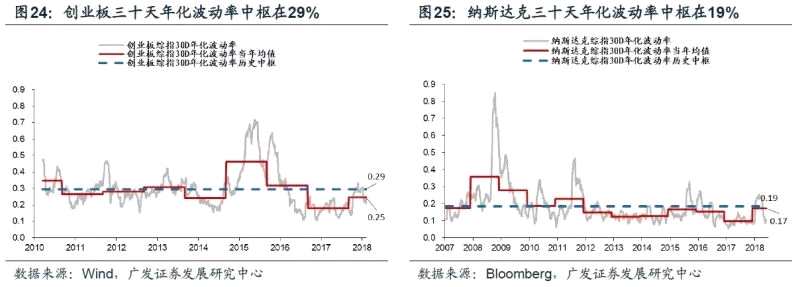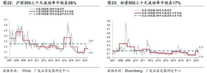 市場(chǎng)的波動(dòng)率最終反映的是市場(chǎng)投資人對(duì)于資產(chǎn)定價(jià)的差異,美股與港股的年化波動(dòng)率中樞相較A股更低。滬深300自2007年以來(lái)的30天年化波動(dòng)率中樞約為26%,而標(biāo)普500則為17%;A股創(chuàng)業(yè)板存在的歷史較短,但自2010年以來(lái),30天波動(dòng)率中樞約為29%,屬于高波動(dòng)市場(chǎng),而容納了眾多國(guó)際公司和國(guó)際投資人的納斯達(dá)克市場(chǎng),07年以來(lái)的30天波動(dòng)率中樞為19%。