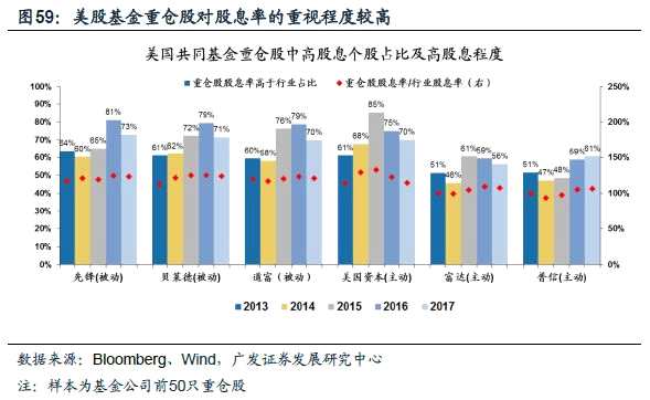 美國(guó)基金重倉(cāng)股的股息率高于行業(yè)整體,A股機(jī)構(gòu)重倉(cāng)股的股息率沒(méi)有表現(xiàn)出顯著高于行業(yè)的特征。分紅能力是海外投資者考量公司質(zhì)量的重要指標(biāo)之一,因此美股基金的重倉(cāng)股中超過(guò)半數(shù)的公司股息率高于行業(yè)整體水平。