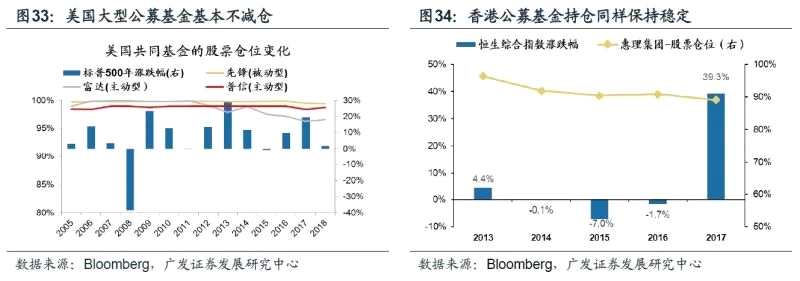 而對(duì)于海外公募基金來(lái)說(shuō),股票倉(cāng)位基本穩(wěn)定在90%以上,與指數(shù)漲跌相關(guān)性不大。美國(guó)最大的先鋒基金與貝萊德公司,股票市值占資產(chǎn)總值的比重基本在滿(mǎn)倉(cāng)狀態(tài)且鮮有調(diào)整;主動(dòng)管理型基金略做倉(cāng)位調(diào)整,但整體倉(cāng)位也在95%,跟美股漲跌起伏關(guān)系不大。香港公募基金結(jié)論類(lèi)似,惠理公司五年間其股票倉(cāng)位僅有小幅的下降,但也保持90%的高倉(cāng)位,并未跟隨港股市場(chǎng)的波動(dòng)做出大幅調(diào)整。