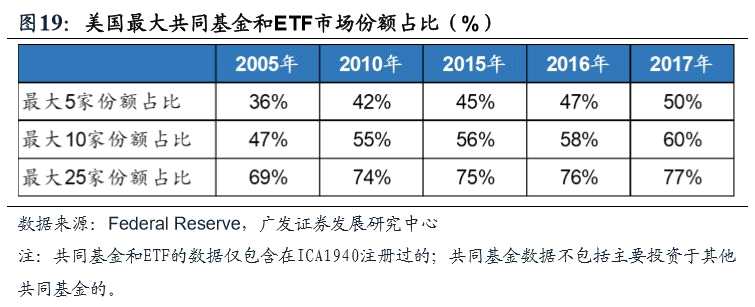 美國(guó)的基金市場(chǎng)份額仍在進(jìn)一步集中,大型基金主導(dǎo)市場(chǎng)風(fēng)格。美國(guó)最大的5家共同基金市場(chǎng)份額從05年的36%提升至17年的50%,市場(chǎng)份額仍在提升。