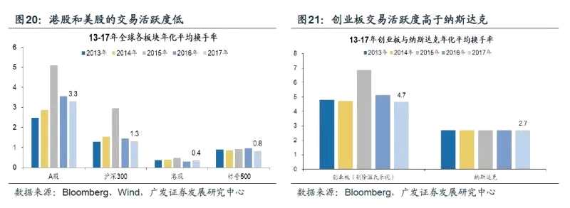 港股和美股的交易活躍度低,投資者傾向于中長(zhǎng)期持有(buy-and-hold)。從13年以來(lái)年化換手率來(lái)看,A股整體持倉(cāng)時(shí)長(zhǎng)3.5個(gè)月,港股的整體持倉(cāng)時(shí)長(zhǎng)約為30個(gè)月,滬深300持倉(cāng)時(shí)長(zhǎng)約9個(gè)月,而標(biāo)普500的持倉(cāng)時(shí)長(zhǎng)約為15個(gè)月。納斯達(dá)克被認(rèn)為是成熟市場(chǎng)中成交最為活躍的市場(chǎng),平均持倉(cāng)時(shí)長(zhǎng)4.5個(gè)月;而A股創(chuàng)業(yè)板的持倉(cāng)時(shí)長(zhǎng)約為2.5個(gè)月。