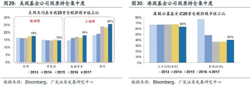 由于海外機(jī)構(gòu)投資者數(shù)據(jù)的可獲取性,下文我們主要選取A股、美股、港股的代表公募基金公司作為機(jī)構(gòu)投資者的核心研究對(duì)象。香港以最大的本土公募基金公司惠理集團(tuán)和最大的海外基金公司匯豐控股作為港股機(jī)構(gòu)投資者的重點(diǎn)研究對(duì)象。美國(guó)由于最大的共同基金公司多為被動(dòng)管理的指數(shù)型,我們著重選取三家被動(dòng)型共同基金(先鋒、貝萊德、道富)和三家主動(dòng)型共同基金(富達(dá)、美國(guó)資本、普信),下文不做特殊說(shuō)明所指“基金”均為上述口徑。