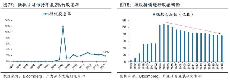 對(duì)于另一類(lèi)美股成長(zhǎng)股,增長(zhǎng)最快的階段已經(jīng)過(guò)去、且沒(méi)有“狼性”的并購(gòu)規(guī)劃,其股價(jià)的上漲主要來(lái)自于持續(xù)的穩(wěn)健分紅與股份回購(gòu),代表公司是微軟 。“科網(wǎng)泡沫”以后,微軟盈利增速的中樞水平從此前的40%下滑至15%左右,PE中樞水平也下降至15倍。業(yè)績(jī)和估值都不具備持續(xù)的向上拉動(dòng),但其股價(jià)仍然超越了“科網(wǎng)泡沫”的最高點(diǎn),主要原因有二——第一來(lái)自于維持高分紅,04年以來(lái)隨著公司業(yè)績(jī)結(jié)束高增長(zhǎng)步入成熟穩(wěn)定期,03年2月微軟宣布第一次現(xiàn)金分紅,并在03-13年間曾連續(xù)10年上調(diào)股息,自此微軟每年始終保持穩(wěn)定在2%比例的現(xiàn)金分紅,成為股息率最高的公司之一,也是很多基金公司最青睞的“穩(wěn)定高收益”公司之一;第二來(lái)自于05年之后開(kāi)啟的股票回購(gòu)計(jì)劃,微軟股票回購(gòu)比例居于美股市場(chǎng)TOP3,每年將巨額現(xiàn)金儲(chǔ)備返還給股東。