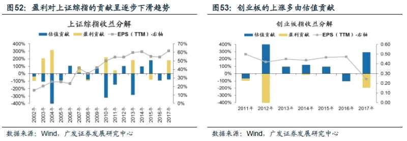 13年以前,A股上證綜指的漲幅拆分中大部分年份由“盈利貢獻(xiàn)”,14-15年流動(dòng)性寬松格局下A股上漲短暫由“估值貢獻(xiàn)”,而17年之后A股再度回到“盈利驅(qū)動(dòng)”。而創(chuàng)業(yè)板上漲多由“估值貢獻(xiàn)”。02-13年,中國(guó)經(jīng)濟(jì)的“增量時(shí)期”,上證綜指的上漲多由盈利貢獻(xiàn),14-15年經(jīng)濟(jì)步入“存量格局”,且央行釋放流動(dòng)性、利率下行驅(qū)動(dòng)估值抬升,市場(chǎng)上漲由估值驅(qū)動(dòng);16-17年,上證綜指再度回到盈利驅(qū)動(dòng)。而A股的創(chuàng)業(yè)板11年以來(lái)上漲多為估值貢獻(xiàn)。