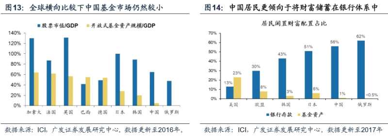 盡管近年A股市場(chǎng)的機(jī)構(gòu)投資者占比有所上升,但相比全球而言,仍處于較低水平,全球橫向?qū)Ρ认?,我?guó)機(jī)構(gòu)投資者仍有較大空間。以我國(guó)開(kāi)放式基金為例,其資產(chǎn)總規(guī)模占GDP的比重明顯偏低,與股票市場(chǎng)的發(fā)達(dá)程度嚴(yán)重不匹配。中國(guó)金融體系長(zhǎng)期由銀行所主導(dǎo),居民習(xí)慣將閑置財(cái)富儲(chǔ)存在大銀行中,而美國(guó)、荷蘭、法國(guó)等國(guó)的基金市場(chǎng)則明顯更發(fā)達(dá),尤其是美國(guó),居民的閑置財(cái)富中有23%會(huì)配置在基金中,而銀行存款占比僅為13%。